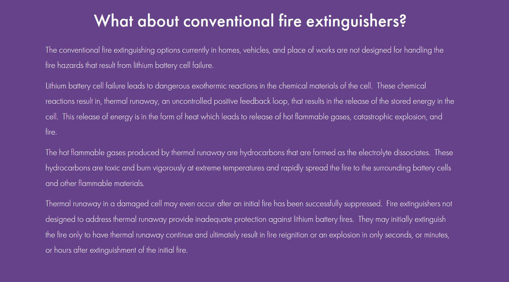 Lithium battery fires are fast and dangerous due to “thermal runaway,” triggered by cell failure from damage, defect, short circuit, overcharging, or overheating. LiCELL™ extinguishers with AVD encapsulate the fire source, creating a non-flammable oxygen barrier and providing a cooling effect to control thermal runaway.