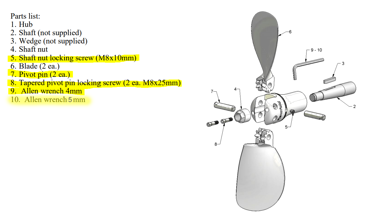 This complete factory hardware service kit V1037 for shaft-mounted 2-Blade Flexofold Props includes: