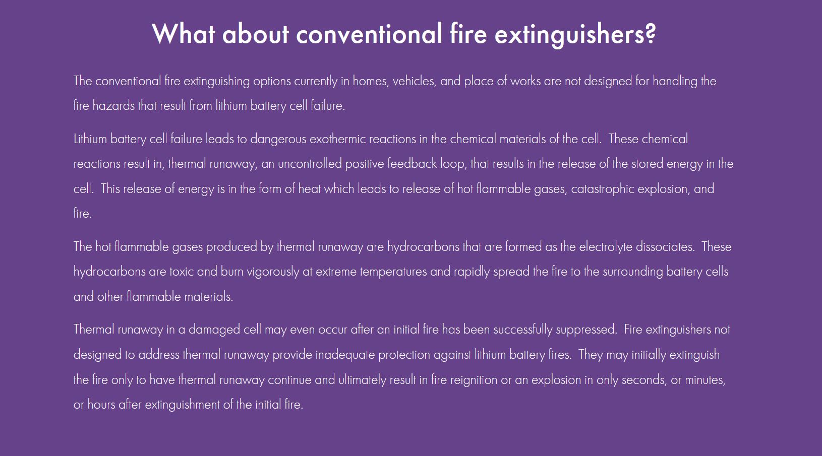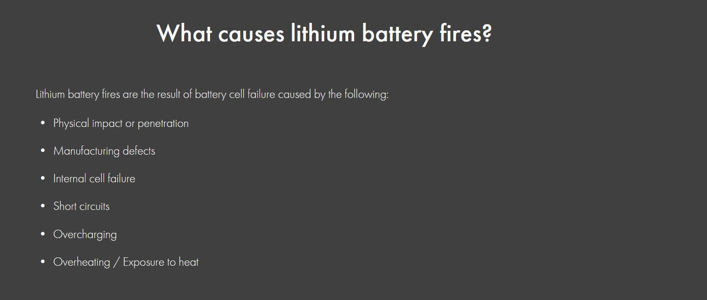 Lithium battery fires are dangerous due to “thermal runaway” caused by cell failure from damage, defect, short circuit, overcharging, or overheating. Thermal runaway leads to rapid chain reactions, escalating fire intensity and duration.