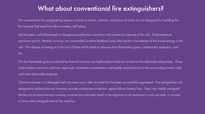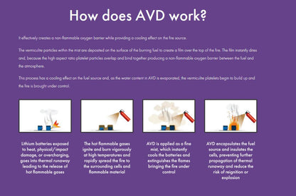 A portable fire extinguisher containing AVD (Aqueous Vermiculite Dispersion) agent, designed to address thermal runaway in lithium battery fires. Suitable for Li-ion, Li-poly, electrical, and class A fires. Environmentally responsible with no GWP (Global Warming Potential) and non-toxic to people, animals, and plants.