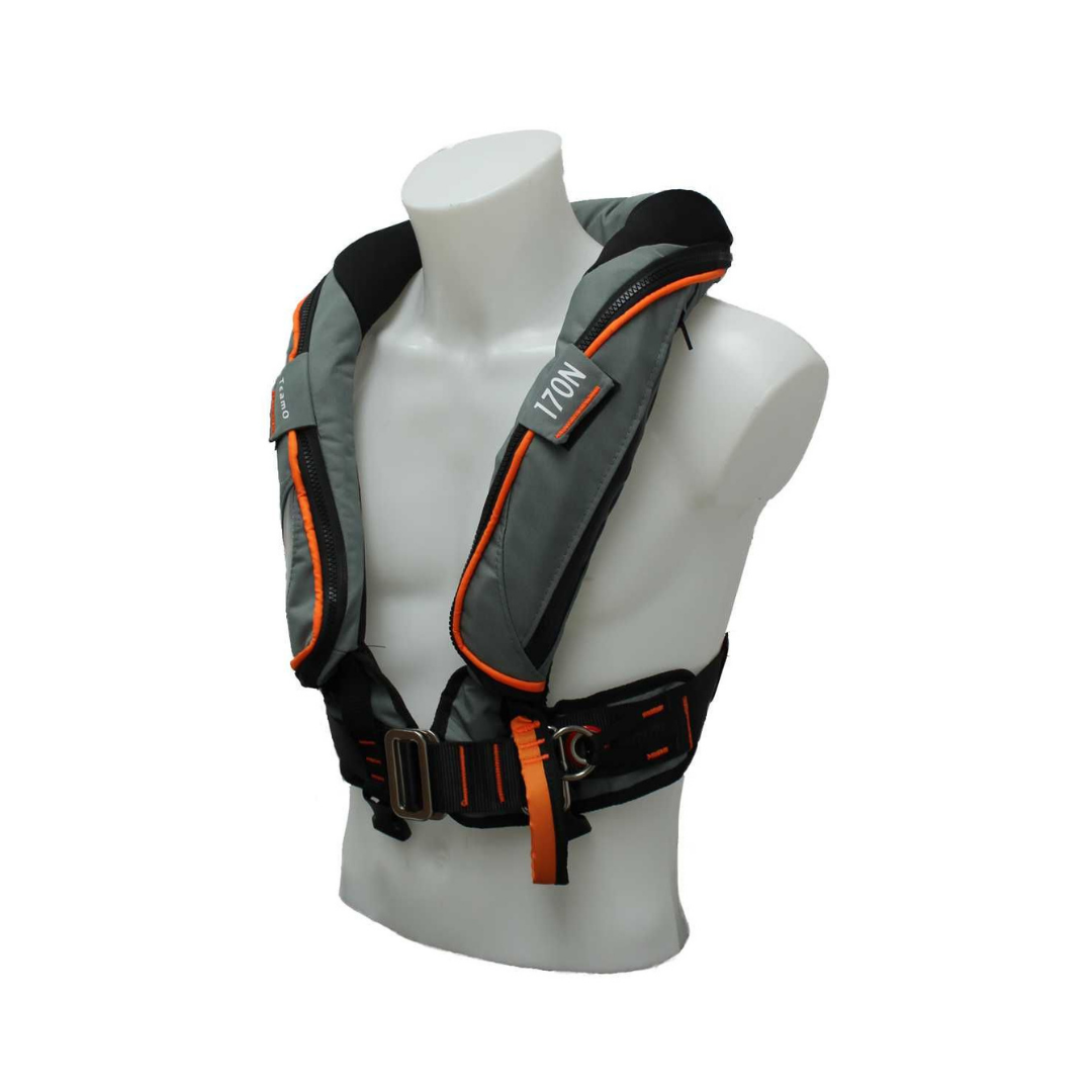 This inflatable harness provides 170 N (≈38 lb) of buoyancy, exceeding the ISO 150 N offshore standard. The added lift rides the wearer higher in chop for better airway clearance and visibility under tow.