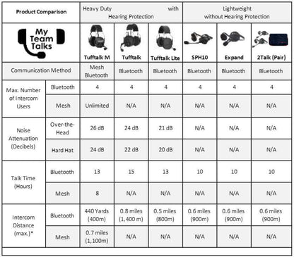 The Tufftalk noise-control line is designed for industrial worksites and high-noise environments where clear communication is required.  Tufftalk headsets have noise reduction rating (NRR) of 24 dB, and the Tufftalk Lite has an NRR or 24dB.  All of our headsets also feature Advanced Noise Control technology to allow for clear communication by reducing the background noise picked up by the microphone.  Tufftalk and Tufftalk Lite utilize Bluetooth 4.1, so they can interface with an optional Mesh technology adapter to enable unlimited group intercom communications. Tufftalks also have built-in FM stereo.  Hard-hat models are also available (20dB NRR).  The newest model, The Tufftalk M, includes both Mesh and Bluetooth integrated into the headset.